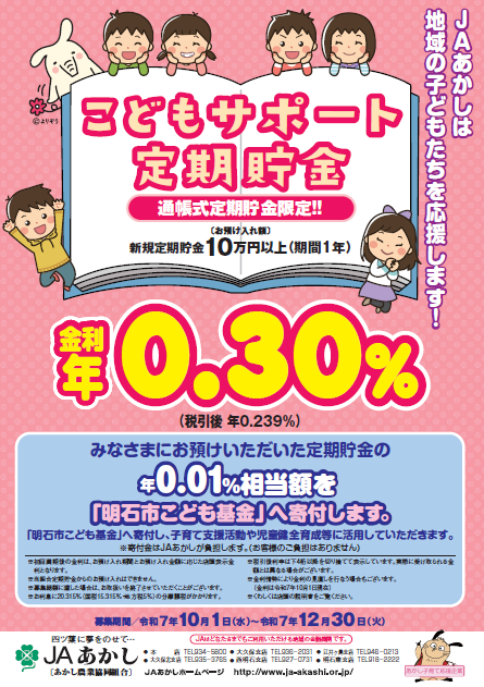 新規定期貯金募集中!お預けいただいた定期貯金の年0.01%相当額を「明石市こども基金」へ寄付します。(令和7年10月1日~令和7年12月30日まで) PDFはこちら