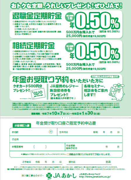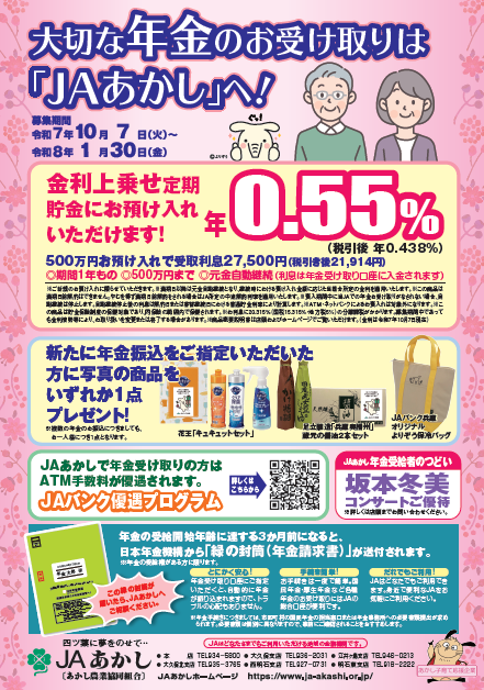 JAあかしで年金をお受け取りいただいている方限定のお得な商品をご用意している他、限定イベントにもご参加いただけます。(令和7年10月7日~令和8年1月30日まで) PDFはこちら