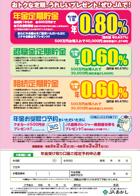 年金お受け取りの方限定定期貯金や、退職金や相続でお受け取りになられた資金をお得な金利でお預けいただける商品をご用意しています。(令和8年2月2日~令和8年3月31日まで) PDFはこちら